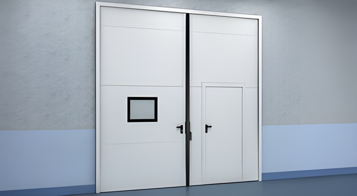 Две створки поставляются в сборе (сэндвич-панели толщиной 80 мм, стальные окантовочные профили, усиливающие уголки, петли со сменной осью, уплотнитель, ригельная задвижка, механический замок)
